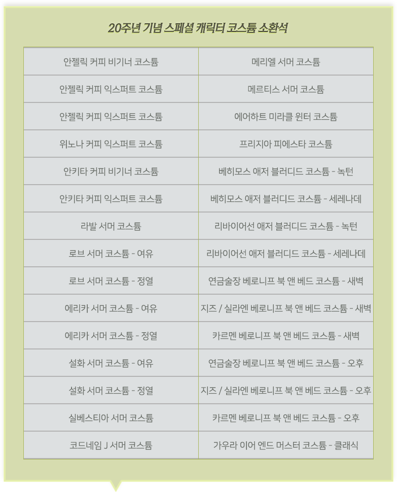 * 스페셜 코스튬 패키지 구매 시, '20주년 기념 토큰' 187개 지급